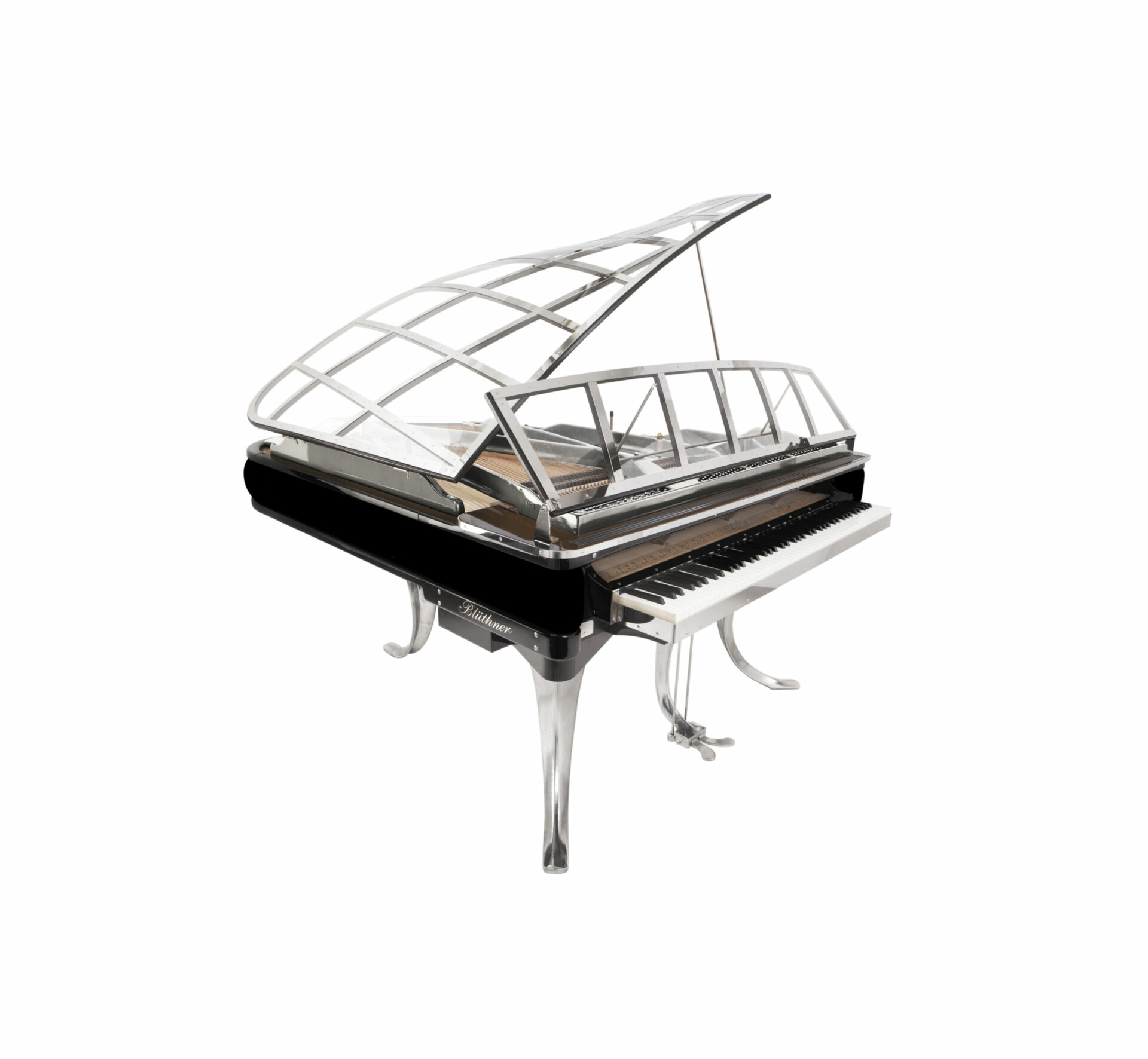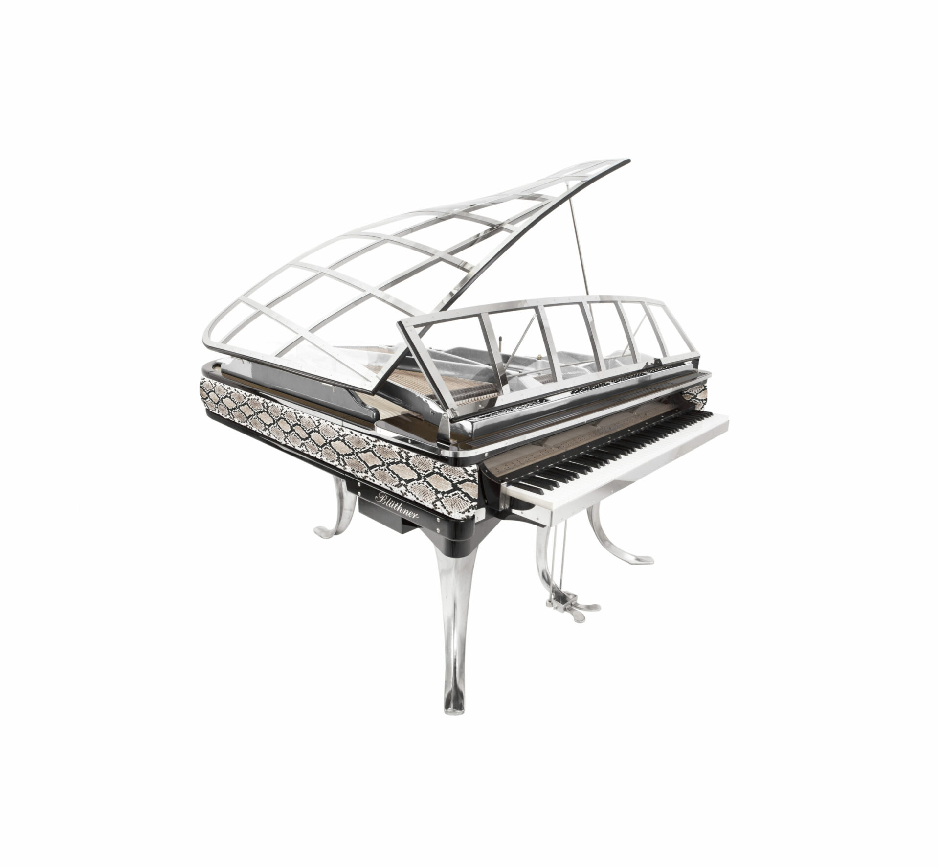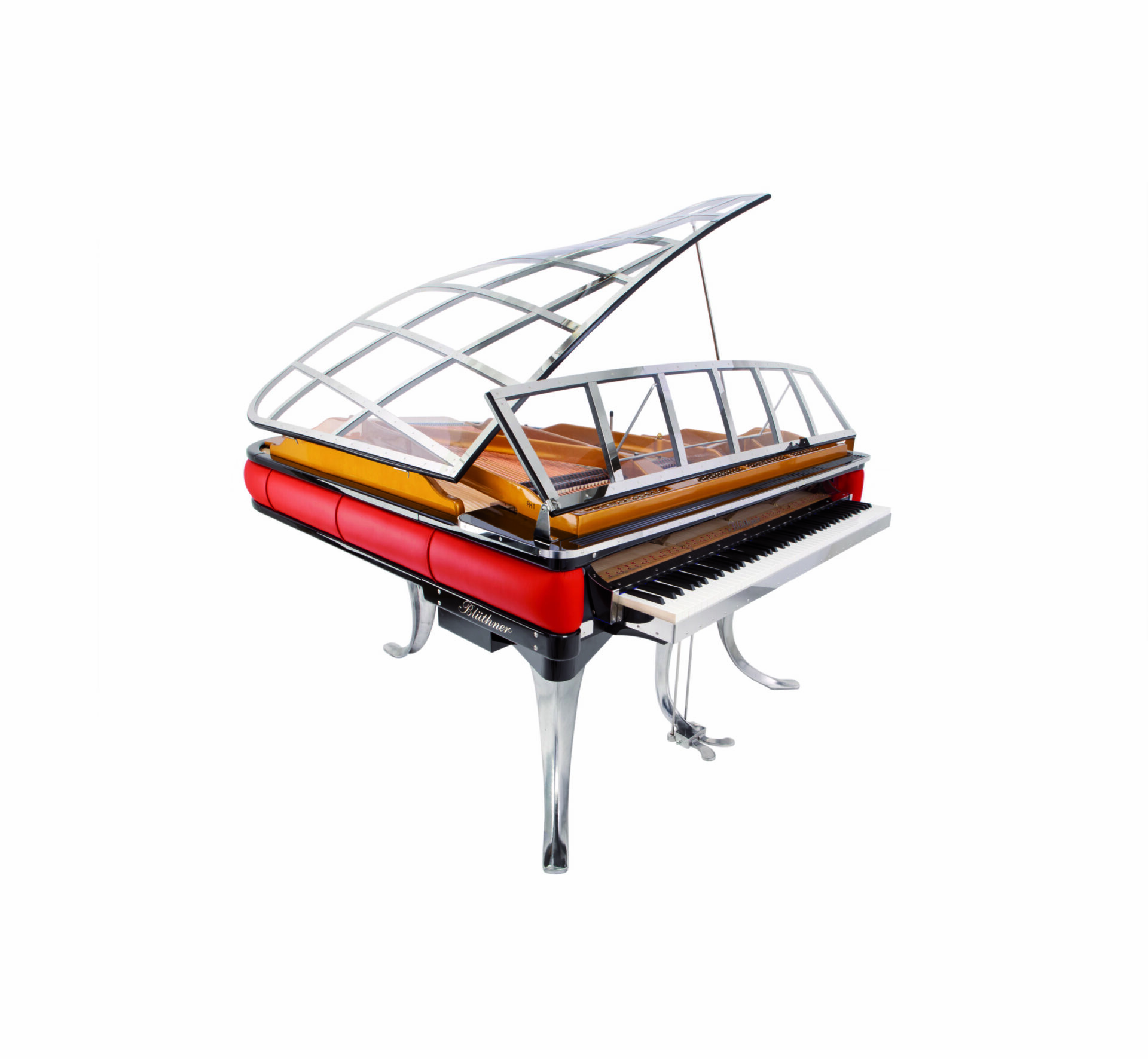 Le talent à l’état pur ! blüthner innove, interpelle et réjouit surtout avec ce fabuleux modèle PH Grand 150, déclinaison acoustique et technique du modèle 11, désigné par l’illustre créateur danois Poul Henningsen en 1930, surnommé PH dans son pays, créateur également d’un autre piano incroyable, le pianette, que blüthner a également réédité dans une version numérique haute en couleur. tout est innovation ici : bien évidemment, l’utilisation de plexi (précisément de l’altuglas, plus résistant dans le temps) transparent se remarque d’emblée et le couvercle ainsi doté évoque avec malice des ailes de libellule, conférant une légèreté inédite à l’ensemble. les pieds et la lyre chromés, aux courbes audacieuses, sont bien évidemment les pattes de cet insecte pianistique. le clavier est proéminent, comme pour inviter chacun à poser ses doigts, à oser s’assoir sans être intimidé. enfin, la ceinture du piano est recouverte d’un cuir que chacun pourra choisir au gré de son imagination, blüthner se chargeant d’accéder à vos moindres désirs en terme de texture et de coloris, sans aucune restriction. les techniciens de l’usine adorent relever les challenges et sont à ce titre particulièrement gâtés par les dirigeants de la marque, les frères christian et knut blüthner, descendants directs du fondateur julius. tous deux sont viscéralement passionnés de piano et désireux à la fois de perpétuer une tradition familiale au prestige mondialement reconnu, tout en renouvelant une image parfois vieillie et un peu désuète de cet instrument, en projetant leur société dans le 21ème siècle et en innovant sans cesse, bien sur esthétiquement comme ici mais aussi techniquement, cherchant sans fin comment rendre encore meilleurs et étonnants leurs pianos. si son design fait du PH Grand une véritable pièce de collection, il ne faut pas oublier que son potentiel musical est à la hauteur de son originalité. cet objet hors norme bénéficie d’une qualité de production dont seule une petite poignée de fabriques peuvent se prévaloir. ce magnifique savoir-faire, visible dans chaque parcelle de l’instrument, renforce encore le plaisir et l’émotion de posséder une telle pièce d’art.