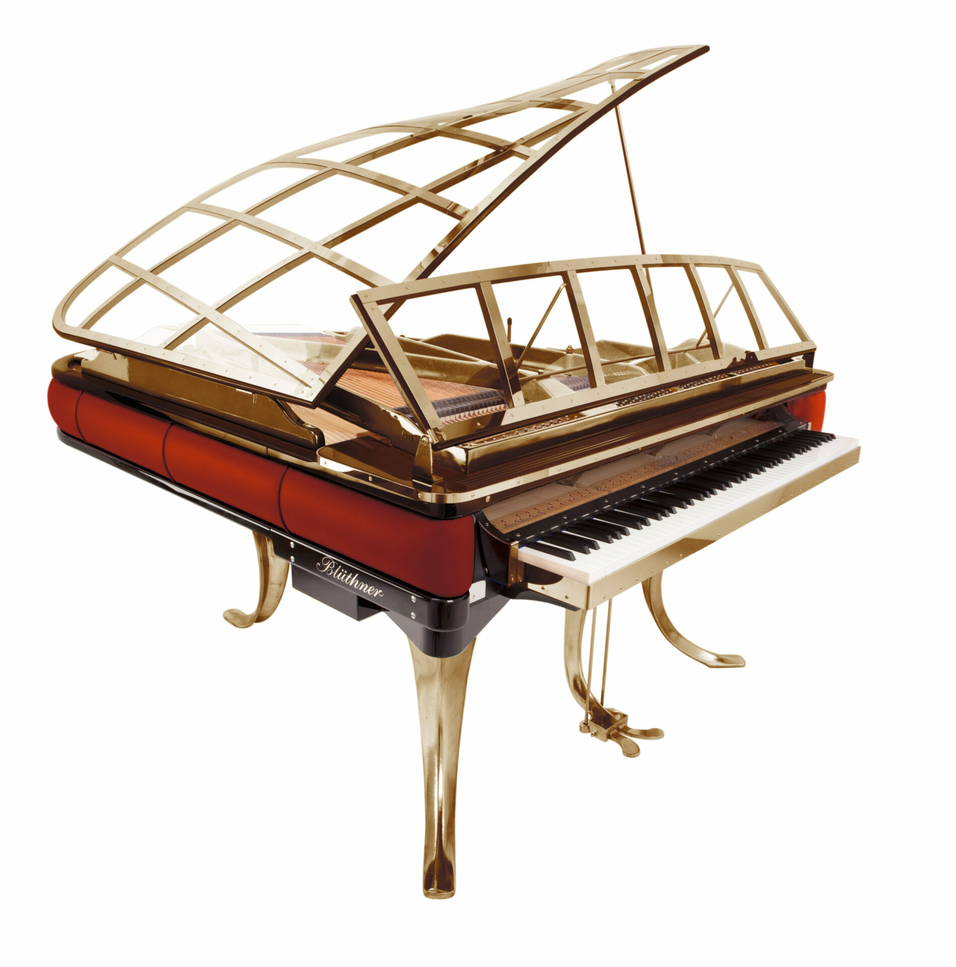 Chez blüthner, la facture haut de gamme se singularise avant tout par la qualité de la sélection des matériaux utilisés, bois, feutres, acier, fonte… ainsi, l’épicéa choisi pour la table d’harmonie doit provenir de forêts d’altitude choisie, doit comporter un nombre de nervures donné, et respecter un temps de séchage établi afin de lui assurer une élasticité idéale pour jouer au mieux son rôle de membrane vibrant sous l’impulsion des cordes et des chevalets dont l’érable massif permet de propager le son plus aisément. il est à noter que l’inclinaison du chevalet de basse permet une meilleure répartition de la charge et une meilleure transmission des vibrations à la table. la mécanique renner, fabriquée selon les critères de la marque, ne comporte que des bois durs et des tissus et feutres en laine dont la parfaite densité assure à l’ensemble résistance et homogénéité. les marteaux sont de la marque abel et distillent une frappe plus onctueuse, idéale pour une tessiture romantique. évidemment le recours aux agrafes est ici un passage obligé pour la qualité finale et assure une parfaite stabilisation des tensions et donc une tenue d’accord très performante. un clavier de la fameuse marque kluge, composé de touches blanches en sapin, de touches noires en ébène et de capsules en hêtre rouge répond à des normes d’équilibrage très pointues assurant une alliance très délicate et peu fréquente entre fluidité et contrôle exemplaires. ce modèle assure ainsi une répétition rapide mais permet également d’aborder la nuance extrême avec une facilité déconcertante. enfin, ce modèle queue offre une exclusivité blüthner : l’aliquot, une quatrième corde mise en résonance par sympathie et non directement par la frappe du marteau, permettant un gain d’harmoniques et un enrichissement du spectre sonore. blüthner a fortement personnalisé l’empreinte sonore du modèle qui dégage une tessiture exempte de toute agressivité et de surcroît inutile de volume dans le forte. la taille du piano le confine naturellement aux pièces réduites et à la musique de chambre. enfin, son meuble, véritable prouesse technique, témoigne du savoir faire infini de l’usine bluthner qui peut tout oser et tout réaliser avec maestria. chacun pourra choisir le coloris du cuir entourant la ceinture et commander ainsi un piano personnalisé à souhait.
