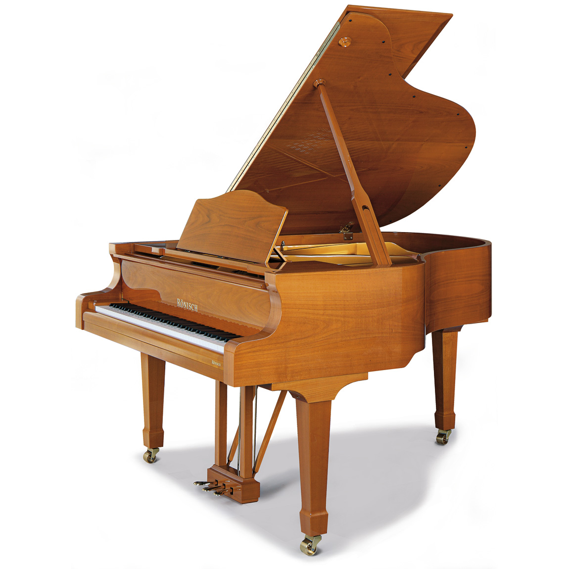 Sur un créneau peu porteur commercialement, les 1/4 queue haut de gamme, Rönisch a pris l’option de proposer de beaux instruments 100% allemands, entièrement fabriqués dans l’usine Blüthner de Leipzig, à un prix très raisonnable. quelques concessions techniques ont été faites pour réussir ce tour de force, sans que la qualité générale n’en pâtisse trop. L’utilisation d’une mécanique Detoa et de marteaux Abel a t-elle été préférée à une mécanique entièrement Renner, plus fluide mais beaucoup plus onéreuse. Cet étonnant queue de salon déploie dans une musicalité limpide, un timbre charnu et homogène au forte sans réelle saturation malgré une longueur de cordes limitée. Comme tous les pianos de la marque, il est particulièrement à l’aise dans les registres doux et très doux ou la fermeté de son clavier couplée à l’utilisation d’une laine de marteaux à moyenne densité laissent beaucoup de champ d’interprétation au pianiste. Instrument idéal pour les amateurs exigeants ou les étudiants désireux de s’aguerrir sur la mécanique à double échappement d’un piano à queue, il trouvera sa place, grâce à une taille plus que respectable, dans les pièces à large capacité ou sur les scènes de petites salles de concert. Enfin, spécialité maison, Rönisch propose un large choix de déclinaisons esthétiques puisque ce modèle se pare de 22 finitions différentes parmi lesquelles des essences rares et précieuses comme le bubinga, le vavona, l’acajou, la ronce de noyer, véritables robes du soir inspirant le plaisir, le luxe, le confort, la pérennité, autant de notions en rapport avec la qualité générale de ces merveilleux pianos.
